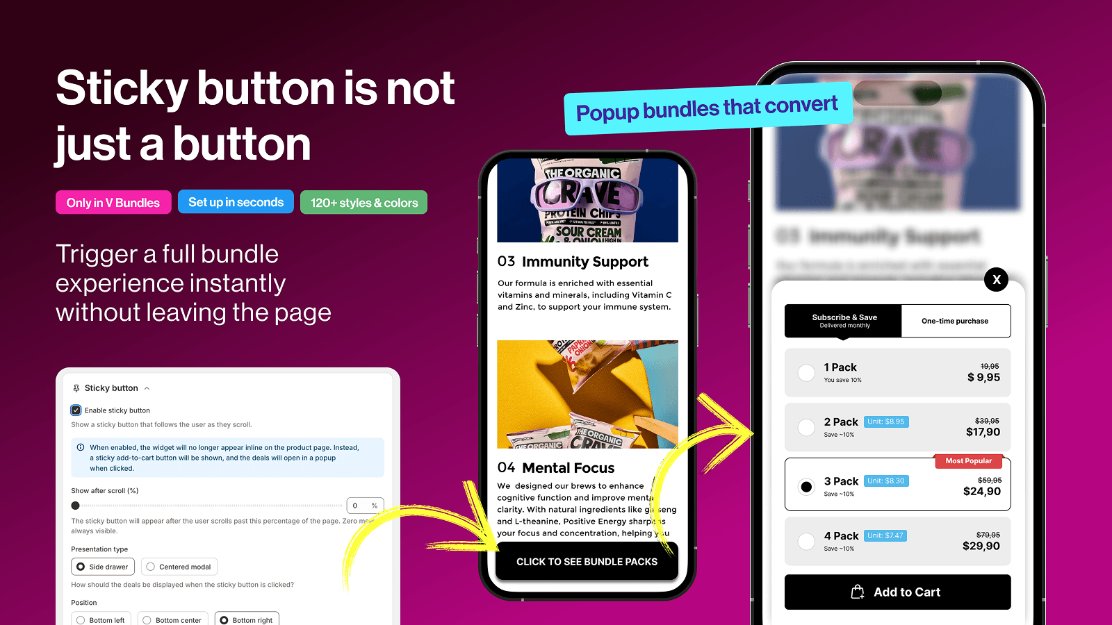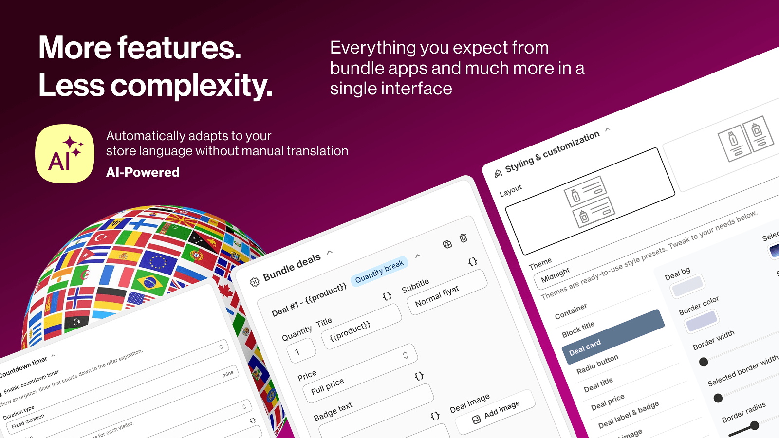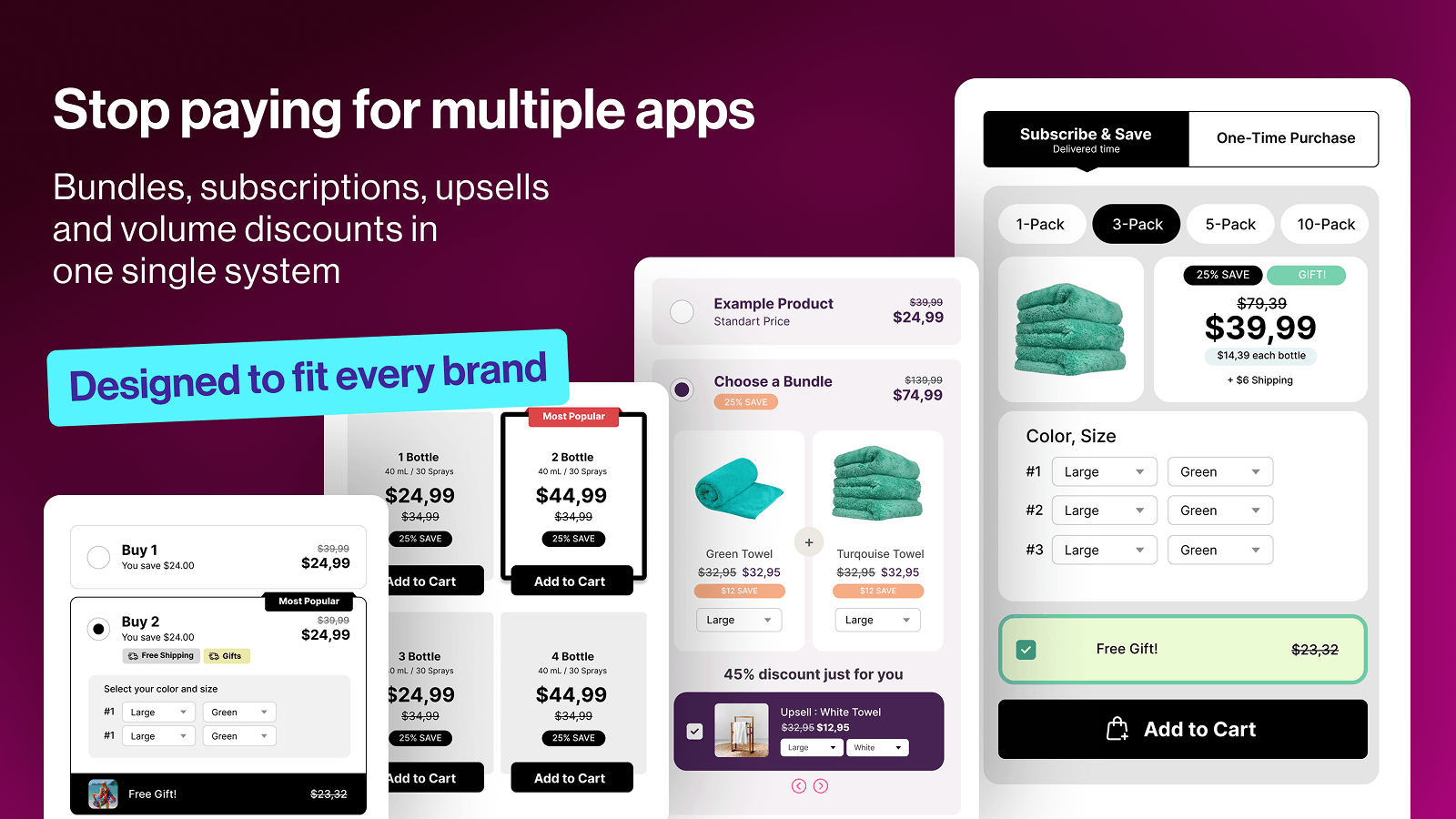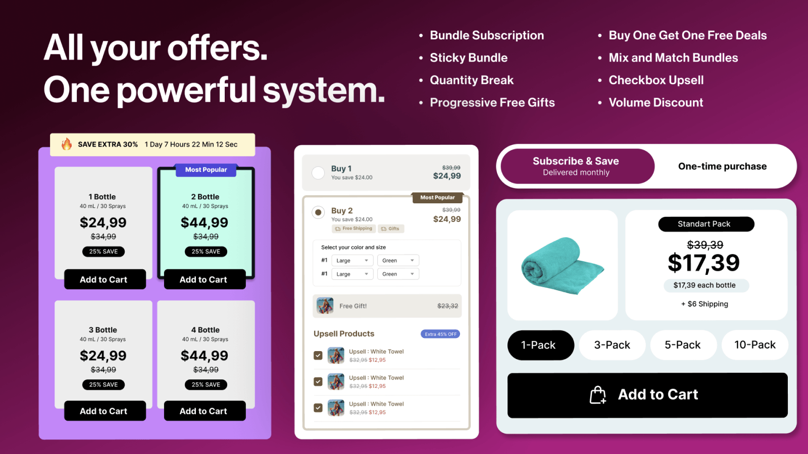 Increase average order value by implementing volume discounts, tiered pricing, BOGO deals and bundles. Simplify the buying process by integrating discounts directly into the product page, eliminating the variant selector to enhance conversions and boost revenue.